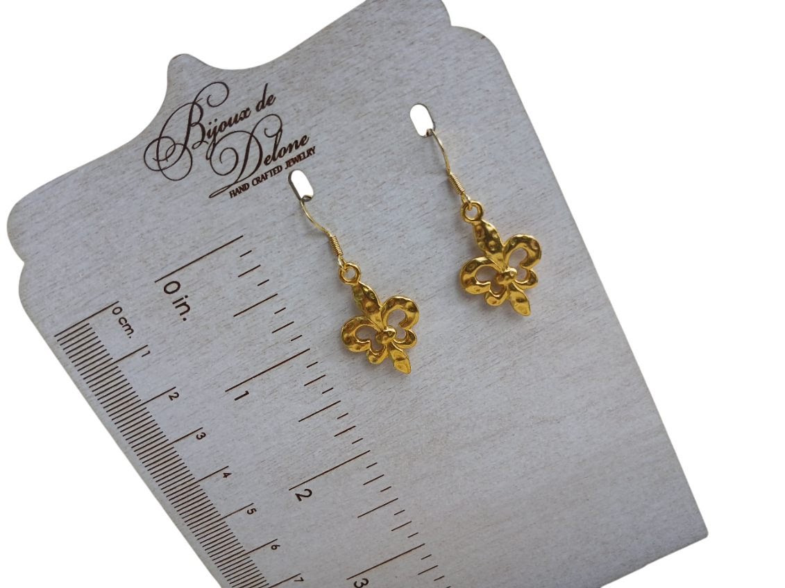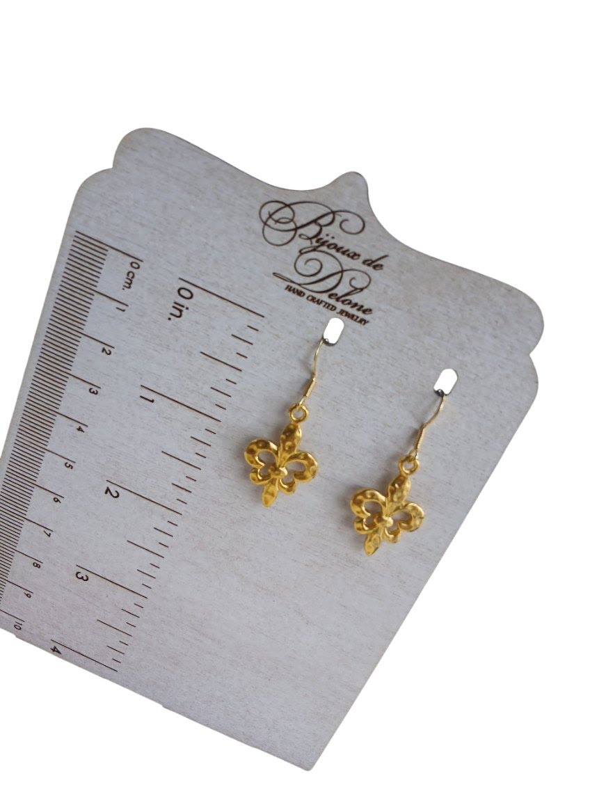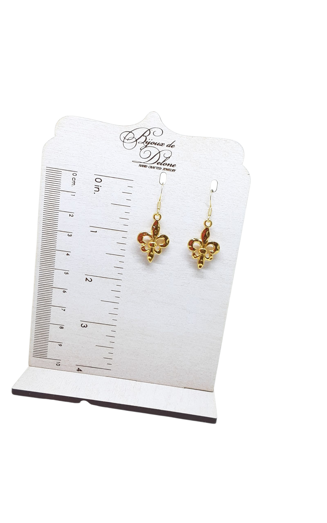 "Add a touch of elegance with our Fleur de lis Earrings! Made with bright gold, these earrings feature a timeless fleur de lis design. Elevate any outfit with this stunning accessory."