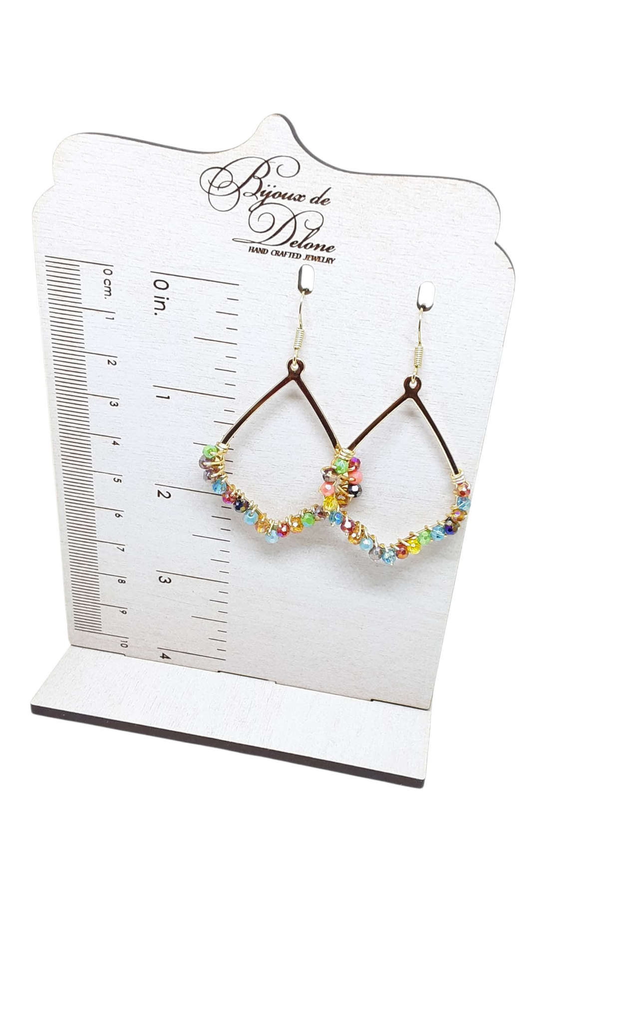 These Multi-colored Crystal Earrings feature dazzling 4mm Chinese crystals intricately wire wrapped to create a vibrant, eye-catching look. Each earring is carefully beaded and finished with elegant gold findings, adding a touch of sophistication. Perfect for brightening any outfit, they offer a unique blend of sparkle and color that effortlessly enhances your style.